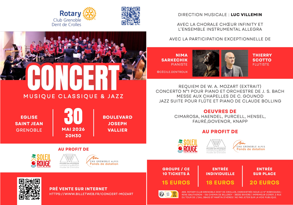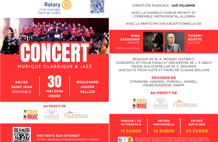 Les enfants sont les bénéficiaires finaux grâce aux associations soutenues par ce concert, organisé par le Rotary Club Grenoble Dent de Crolles, avec Nima Sarkechik, pianiste et Thierry Scotto, flutiste, avec la Chorale Chœur Infinity et l'Ensemble Instrumental Allegra, sous la direction musicale de Luc Villemin. Les différentes associations soutenues sont: