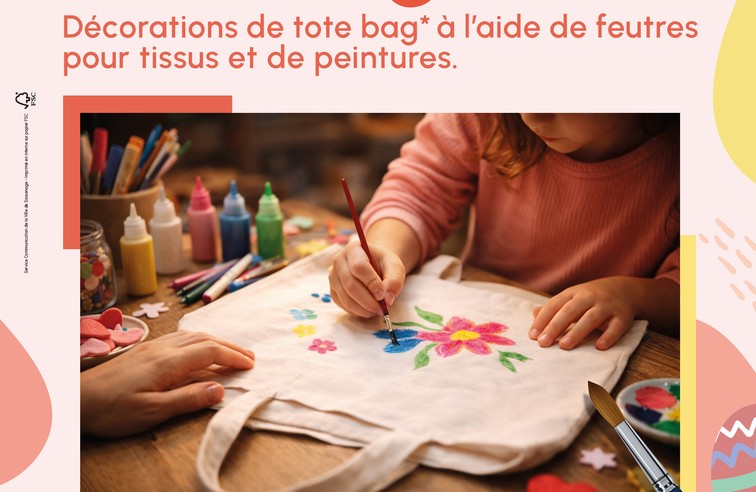 Le mardi 14 avril, de 14h30 à 16h30, le CCAS propose un atelier parent-enfant dédié à la décoration de tote bags. Un moment convivial et créatif à partager en famille, où chacun pourra laisser libre cours à son imagination.