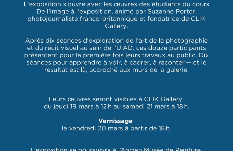 L’exposition présente les œuvres des étudiants du cours de l'UIAD "De l’image à l’exposition", animé par Suzanne Porter,