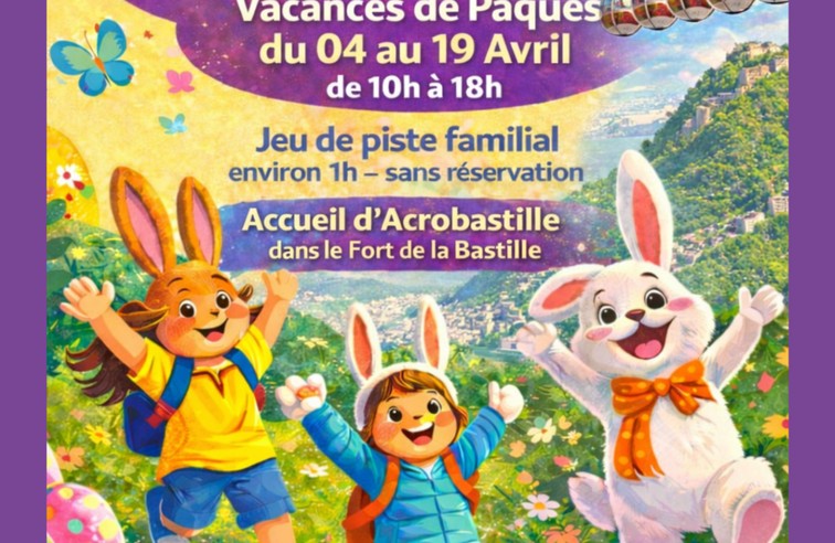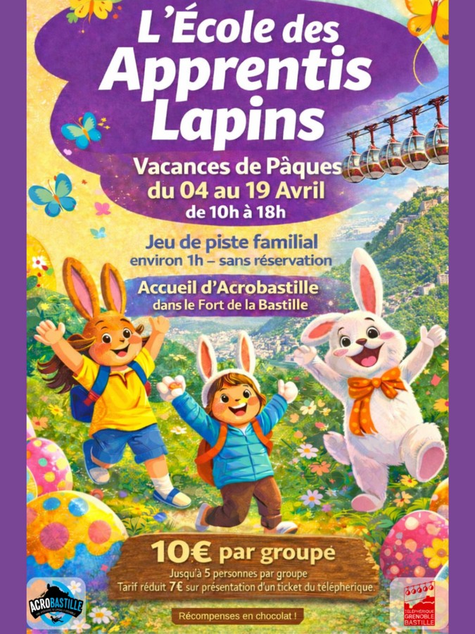 Du 4 au 19 avril 2026, le parc de loisirs Acrobastille en partenariat avec la Régie du Téléphérique a le plaisir de vous proposer un jeu de piste spécial Pâques : l'École des Apprentis Lapins !