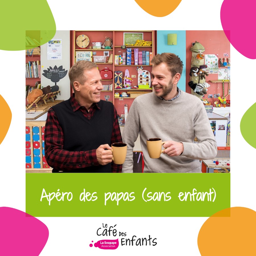 Le Café des Enfants La Soupape organise « Apéros des Papas » : un temps convivial entre pères, futurs pères et beaux-pères pour échanger, partager, s’entraider et découvrir l’association autour d’un verre (sans alcool) et de jeux.