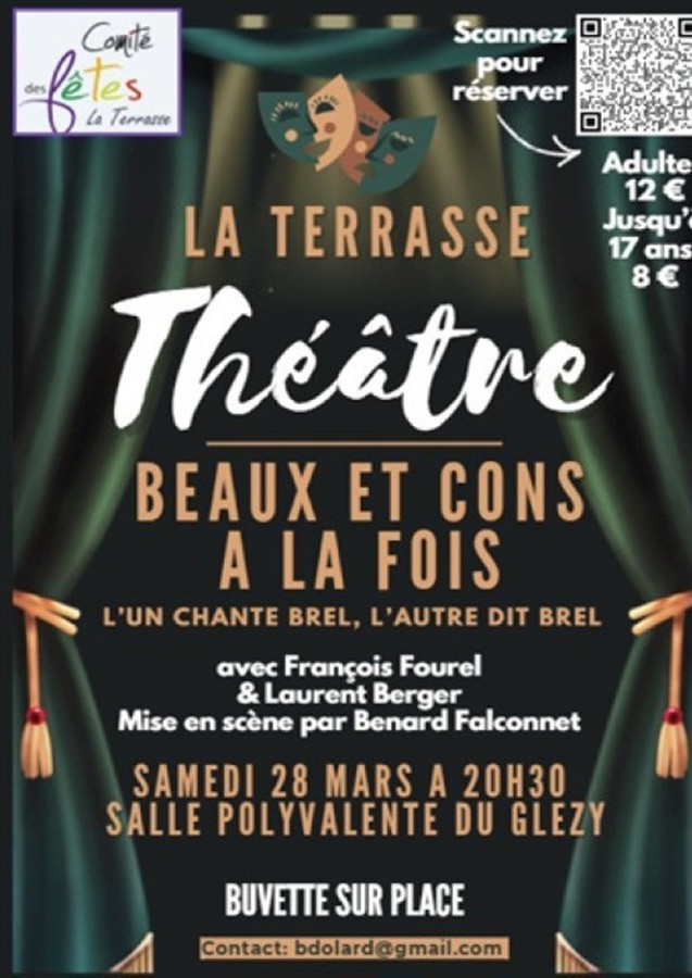 Le comité des fêtes vous propose du théâtre musical "Beaux et cons à la fois". Une mise en scène par Bernard Falconnet. L'un chante Brel et l'autre dit Brel. Ce spectacle se laisse boire avec un immense délice. On sort un peu groggy, un excès d’émotions.