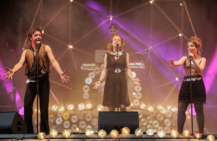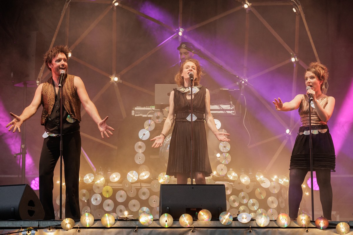 Une sorte de grande “géode à facettes” qui baigne la piste de danse de lumières, un DJ au centre, et devant, trois chanteurs étincelants qui, entre deux morceaux, vous suggèrent quelques mouvements bien sentis, et de la musique de Boum internationale dans laquelle se presse et se percute TOUT le répertoire de la Chanson Française : bienvenue dans le Bal à facettes !