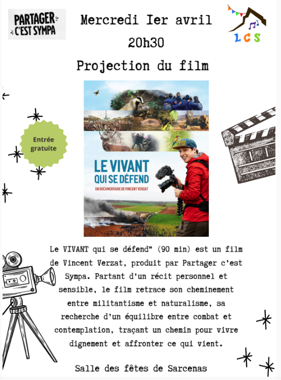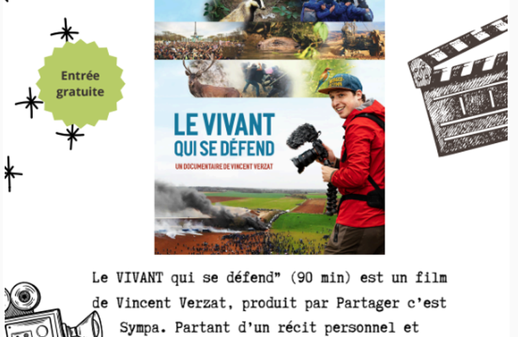 Projection du film "Le VIVANT qui se défend" (90 min) de Vincent Verzat, produit par Partager c'est Sympa. Le film retrace son cheminement entre militantisme et naturalisme, sa recherche d'un équilibre entre combat et contemplation.