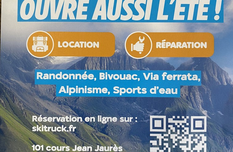 SkiTruck propose du matériel de ski alpin et de ski de randonnée à la vente et à la location pour toutes les durées. Le magasin élargi désormais ces offres en été au matériel d'alpinisme, de bivouac, de via ferrata et de sports d'eau notamment.